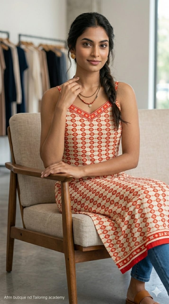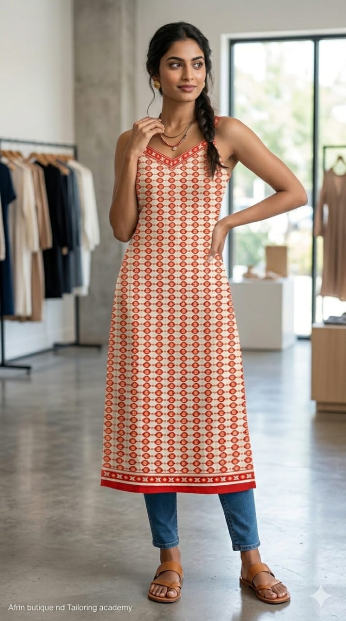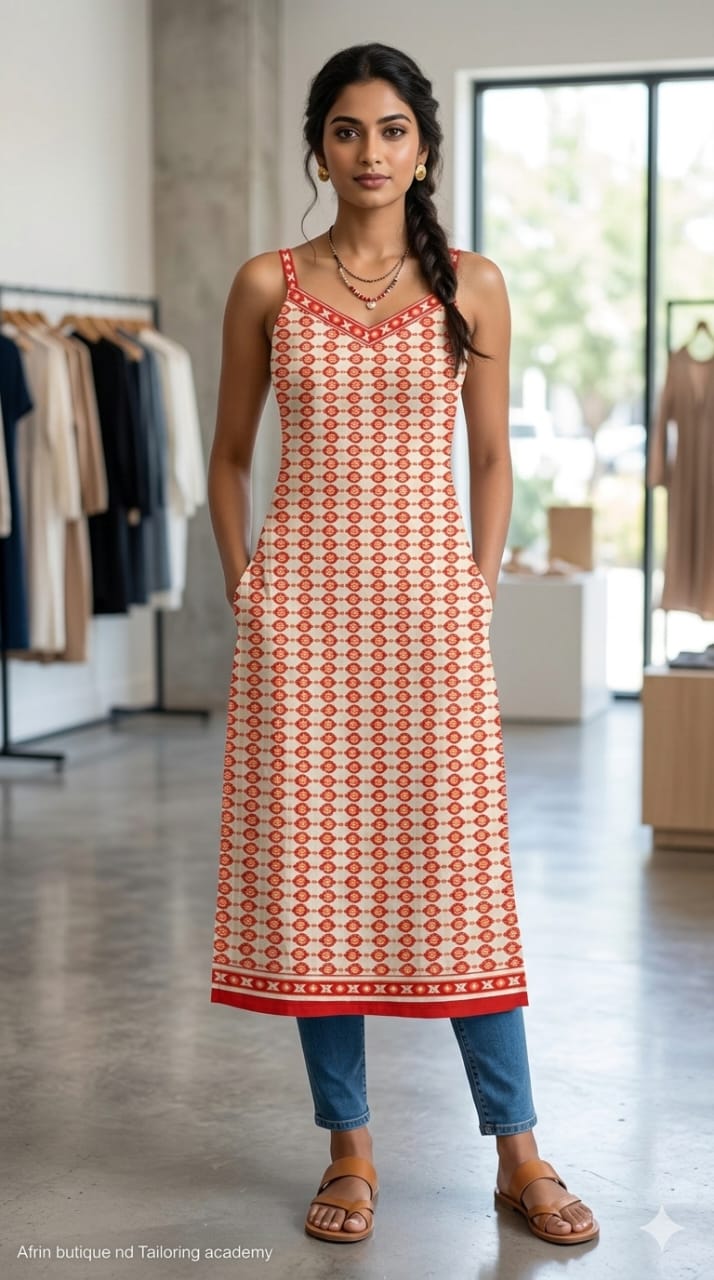 Minimal and trendy sleeveless kurti with elegant prints, ideal for summer and daily wear styling.