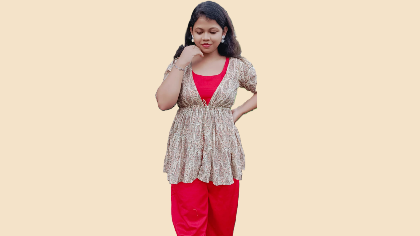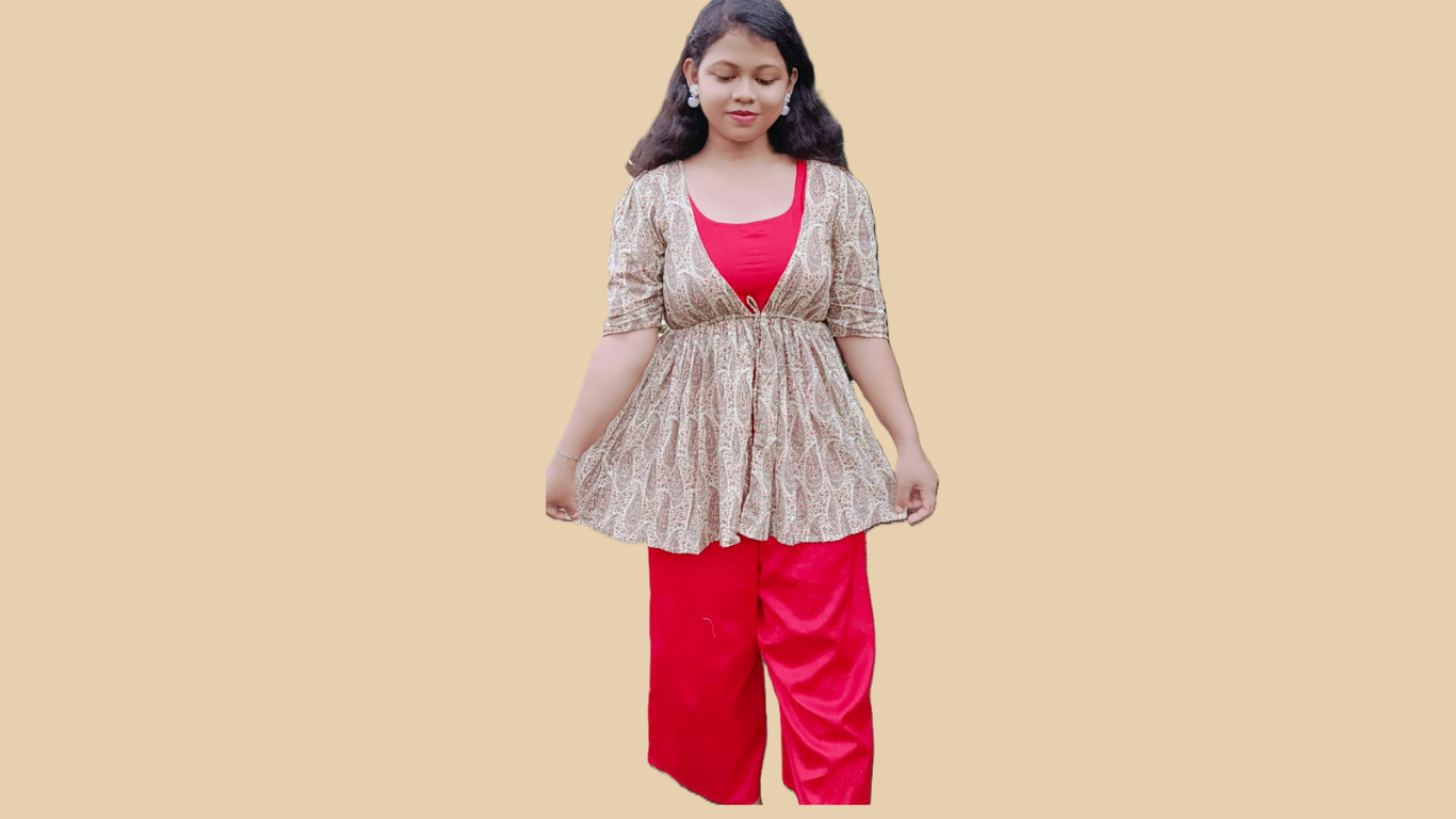 Elegant women’s co-ord set featuring red inner with printed shrug for a modern ethnic look.